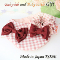 優しい雰囲気の淡いピンクのギンガムチェックが品よくやさしいお嬢様スタイルでおしゃれな雰囲気のスタイとシュシュ形ラトルのセット。 今までにないフロント止タイプのよだれかけで、前が2重になっているので、歯が生えてきてよだれが多くなってきても、お洋服をしっかり守ってくれます。 よだれかけカラーにあわせた大きなぷっくりピンクリボンがとってもキュートで、用途や場所を問わず、付け襟風にも品よく通年を通して使えます。 また、お揃いのシュシュ形ラトルはジュメル神戸のオリジナルデザイン。つなぎ目もなくすぽっと手首や足首に通すだけで可愛く品よく使えます。ラトルはシュシュの形ですので、成長されましたらシュシュとしてお使いいただけます。長く使える可愛いラトルも入ったセットは、出産祝いやちょっとした贈物としても可愛く素敵です。 素材 表生地:綿60% 麻40% 裏生地:綿100% リボン:ポリエステル ※洗濯機・乾燥機不可・手洗いのみ サイズ 直径:約21cm 前:約11cm/後:約7cm 首回り:約30~33cm ※よだれもれ防止のため、市販の一般的なスタイよりも、首回りが小さめでのお作りでございます。 推奨年齢:生後すぐ~2歳まで 製造国:神戸(日本)