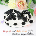 ホワイト地に黒の大きなドットがクールでおしゃれな雰囲気のスタイ。 今までにないフロント止タイプのよだれかけで、前が2重になっているので、歯が生えてきてよだれが多くなってきても、お洋服をしっかり守ってくれます。 よだれかけカラーにあわせた大きなぷっくりブラック(黒)リボンがとってもキュートで、用途や場所を問わず、付け襟風にも品よく通年を通して使えます。 また、お揃いのシュシュ形ラトルはジュメル神戸のオリジナルデザイン。つなぎ目もなくすぽっと手首や足首に通すだけで可愛く品よく使えます。ラトルはシュシュの形ですので、成長されましたらシュシュとしてお使いいただけます。長く使える可愛いラトルも入ったセットは、出産祝いやちょっとした贈物としても可愛く素敵です。