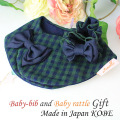 グリーンとネイビーの入ったギンガムチェックが品よくお嬢様スタイルでおしゃれな雰囲気のスタイ。 今までにないフロント止タイプのよだれかけで、前が2重になっているので、歯が生えてきてよだれが多くなってきても、お洋服をしっかり守ってくれます。 よだれかけカラーにあわせた大きなぷっくりブラック(黒)リボンがとってもキュートで、用途や場所を問わず、付け襟風にも品よく通年を通して使えます。 また、お揃いのシュシュ形ラトルはジュメル神戸のオリジナルデザイン。つなぎ目もなくすぽっと手首や足首に通すだけで可愛く品よく使えます。ラトルはシュシュの形ですので、成長されましたらシュシュとしてお使いいただけます。長く使える可愛いラトルも入ったセットは、出産祝いやちょっとした贈物としても可愛く素敵です。