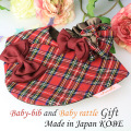 レッドのタータンチェックがクラシカルでおしゃれな雰囲気のスタイ。 今までにないフロント止タイプのよだれかけで、前が2重になっているので、歯が生えてきてよだれが多くなってきても、お洋服をしっかり守ってくれます。 よだれかけカラーにあわせた大きなぷっくりボルドーリボンがとってもキュートで、用途や場所を問わず、付け襟風にも品よく通年を通して使えます。 また、お揃いのシュシュ形ラトルはジュメル神戸のオリジナルデザイン。つなぎ目もなくすぽっと手首や足首に通すだけで可愛く品よく使えます。ラトルはシュシュの形ですので、成長されましたらシュシュとしてお使いいただけます。長く使える可愛いラトルも入ったセットは、出産祝いやちょっとした贈物としても可愛く素敵です。