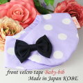 やさしい雰囲気のやわらかい淡いパープル地におおきな白(ホワイト)ドットがとてもお上品可愛いおしゃれな雰囲気のスタイ。 今までにないフロント止タイプのよだれかけで、前が2重になっているので、歯が生えてきてよだれが多くなってきても、お洋服をしっかり守ってくれます。 よだれかけカラーにアクセントで映える大きなぷっくりネイビーのおリボンがとってもキュートで、用途や場所を問わず品よく通年を通して使えます。 出産祝いやちょっとした贈物としても可愛く素敵です。 素材 表生地:綿100% 裏生地:綿100% リボン:ポリエステル ※洗濯機・乾燥機不可・手洗いのみ サイズ 直径:約21cm 前:約11cm/後:約7cm 首回り:約30~33cm ※よだれもれ防止のため、市販の一般的なスタイよりも、首回りが小さめでのお作りでございます。 推奨年齢:生後すぐ~2歳まで 製造国:神戸(日本)