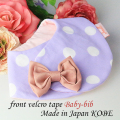 やさしい雰囲気のやわらかい淡いパープル地におおきな白(ホワイト)ドットがとてもお上品可愛いおしゃれな雰囲気のスタイ。 今までにないフロント止タイプのよだれかけで、前が2重になっているので、歯が生えてきてよだれが多くなってきても、お洋服をしっかり守ってくれます。 よだれかけカラーにアクセントで映える大きなぷっくりピンクのおリボンがとってもキュートで、用途や場所を問わず品よく通年を通して使えます。 出産祝いやちょっとした贈物としても可愛く素敵です。 素材 表生地:綿100% 裏生地:綿100% リボン:ポリエステル ※洗濯機・乾燥機不可・手洗いのみ サイズ 直径:約21cm 前:約11cm/後:約7cm 首回り:約30~33cm ※よだれもれ防止のため、市販の一般的なスタイよりも、首回りが小さめでのお作りでございます。 推奨年齢:生後すぐ~2歳まで 製造国:神戸(日本)