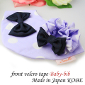 やさしい雰囲気のやわらかい淡いパープル地におおきな白(ホワイト)ドットがとてもお上品可愛いおしゃれな雰囲気のスタイ。 今までにないフロント止タイプのよだれかけで、前が2重になっているので、歯が生えてきてよだれが多くなってきても、お洋服をしっかり守ってくれます。 大きなぷっくりネイビーリボンがとっても女の子らしくクールビューティーで、用途や場所を問わず付け襟風にも可愛く、通年を通して使えます。 また、お揃いのシュシュ形ラトルはジュメル神戸のオリジナルデザイン。 つなぎ目もなくすぽっと手首や足首に通すだけで可愛く品よく使えます。 ラトルはシュシュの形ですので、成長されましたらシュシュとしてお使いいただけます。 長く使える可愛いラトルも入ったセットは、出産祝いやちょっとした贈物としても可愛く素敵です。