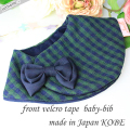 グリーンとネイビーのギンガムチェックが品よくやさしいお嬢様スタイルでおしゃれな雰囲気のスタイ。 今までにないフロント止タイプのよだれかけで、前が2重になっているので、歯が生えてきてよだれが多くなってきても、お洋服をしっかり守ってくれます。 裏生地にあわせた大きなぷっくりネイビー(紺)リボンがとってもキュートで、用途や場所を問わず品よく通年を通して使えます。 出産祝いやちょっとした贈物としても可愛く素敵です。 素材 表生地:綿60% 麻40% 裏生地:綿100% リボン:ポリエステル ※洗濯機・乾燥機不可・手洗いのみ サイズ 直径:約21cm 前:約11cm/後:約7cm 首回り:約30~33cm ※よだれもれ防止のため、市販の一般的なスタイよりも、首回りが小さめでのお作りでございます。 推奨年齢:生後すぐ~2歳まで 製造国:神戸(日本)