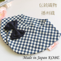 おしゃれでかわいい小さなレディーに。兵庫県の伝統織物播州織物から上質コットン生地を使ったネイビーギンガムチェックが可愛くておしゃれな雰囲気の女の子用スタイです。 今までにないフロント止タイプのよだれかけで、前が2重になっているので、歯が生えてきてよだれが多くなってきても、お洋服をしっかり守ってくれます。生地にあわせた大きなぷっくりネイビーリボンがとってもキュートで、用途や場所を問わず品よく通年を通して使えます。出産祝いやちょっとした贈物としても可愛く素敵です。 素材 表生地:播州織綿100% 裏生地:播州織綿100% リボン:ポリエステル ※洗濯機・乾燥機不可・手洗いのみ サイズ 直径:約21cm 前:約11cm/後:約7cm 首回り:約30~33cm ※よだれもれ防止のため、市販の一般的なスタイよりも、首回りが小さめでのお作りでございます。 推奨年齢:生後すぐ~2歳まで 製造国:神戸(日本)
