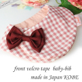 よだれかけカラーにあわせた大きなぷっくりピンクリボンがとってもキュートで、用途や場所を問わず品よく通年を通して使えます。