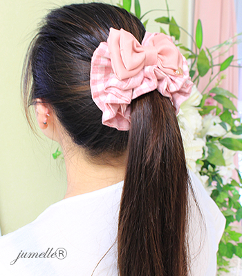 お選び頂いた(料金;別途)ジュメルの親子お揃いシュシュを、シュシュ袋(無料)に品良くお入れして、バスケットに可愛くお入れ致します。