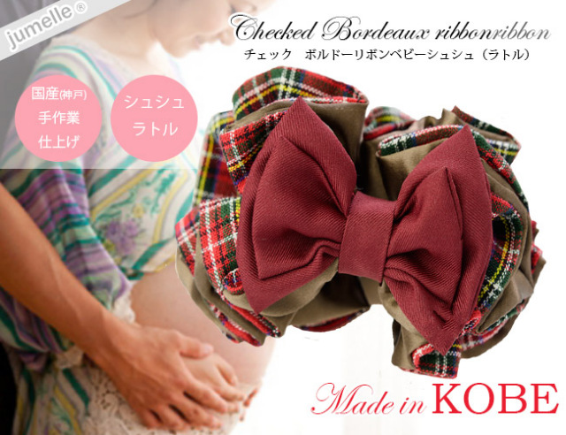 • 【親子お揃いプレゼント】チェックとボルドーリボンのベビーシュシュ(ラトル)【出産祝い/誕生日/ジュメル神戸】【送料半額対象】