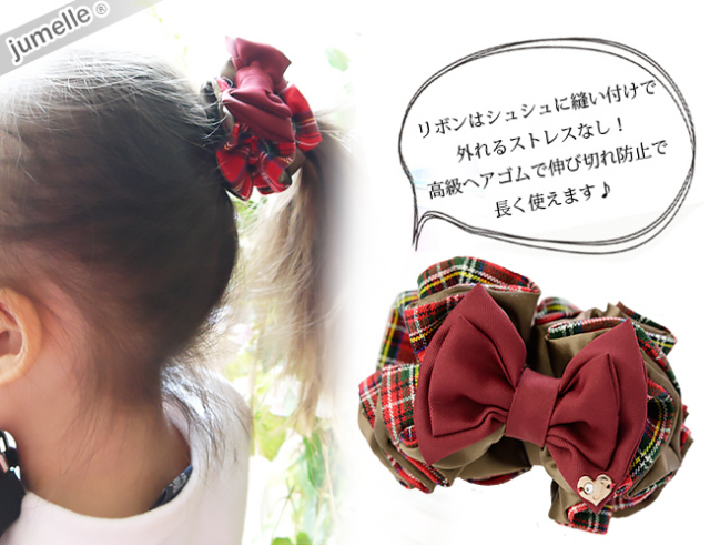 【親子お揃いプレゼント】チェックとボルドーリボンガールズシュシュ【出産祝い/誕生日/オシャレ】サイズ