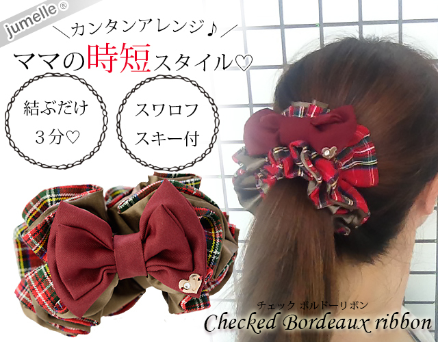 【親子お揃いプレゼント】チェックとボルドーリボンママシュシュ【出産祝い/誕生日/オシャレ】サイズ
