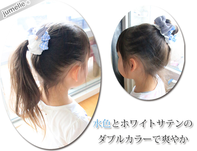 お選び頂いた(料金;別途)ジュメルの親子お揃いシュシュを、シュシュ袋(無料)に品良くお入れして、バスケットに可愛くお入れ致します。