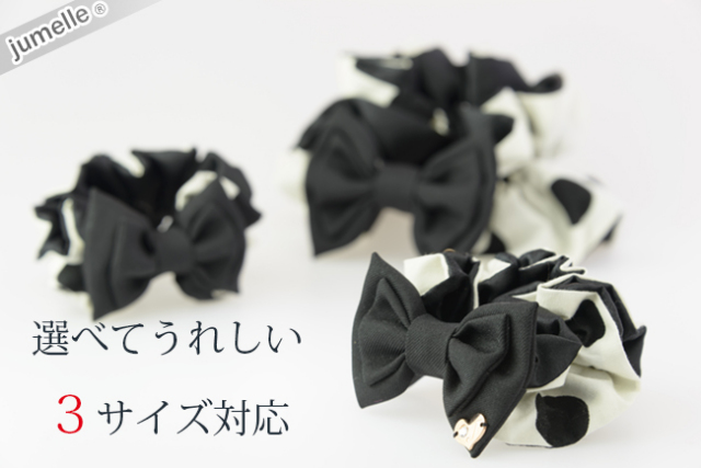 お選び頂いた(料金;別途)ジュメルの親子お揃いシュシュを、シュシュ袋(無料)に品良くお入れして、バスケットに可愛くお入れ致します。