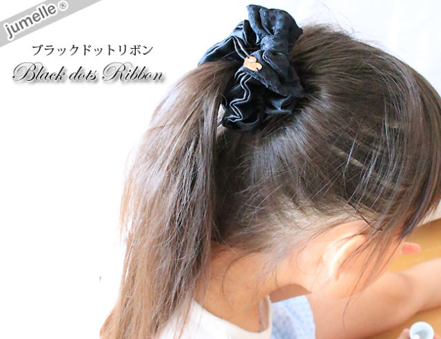 親子お揃い(ペアヘアアクセサリー)専門店ジュメルブラックサテンと黒ドットリボンガールズシュシュ【出産祝い/誕生日/子ども】メイン
