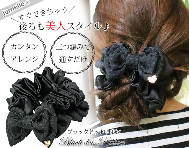 親子お揃い(ペアヘアアクセサリー)専門店ジュメルブラックサテンと黒ドットリボンガールズシュシュ【出産祝い/誕生日/妻】サイズ小
