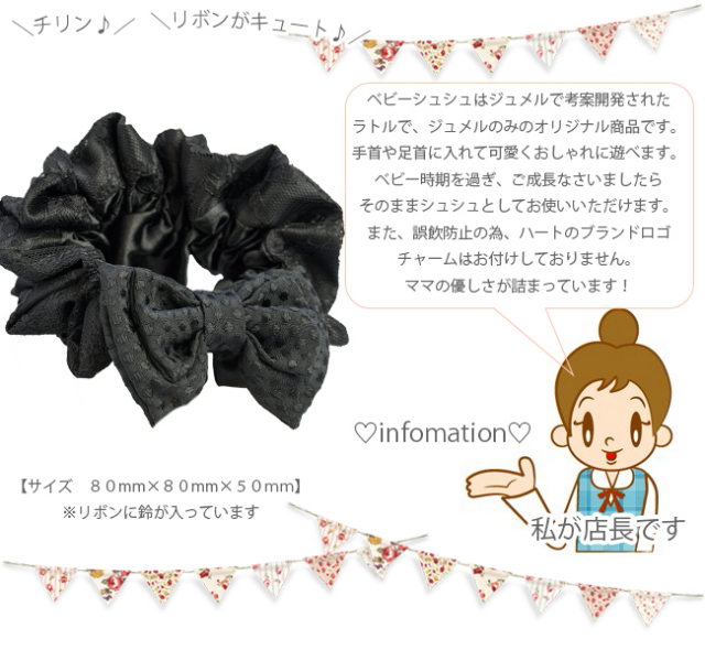 親子お揃い(ペアヘアアクセサリー)専門店ジュメルブラックレースと黒ドットリボンベビーラトル【出産祝い/誕生日/シュシュ】メイン1 <