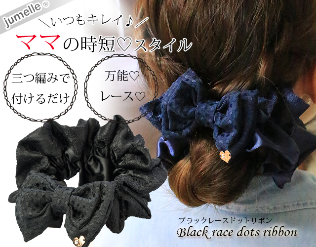 親子お揃い(ペアヘアアクセサリー)専門店ジュメルブラックレースと黒ドットリボンガールズシュシュ【出産祝い/誕生日/妻】サイズ小