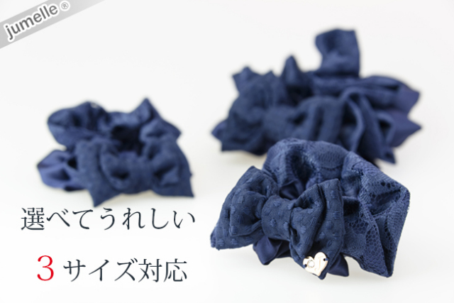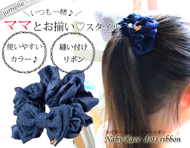 親子お揃い(ペアヘアアクセサリー)専門店ジュメルネイビーレースと紺ドットリボンガールズシュシュ【出産祝い/誕生日/妻】サイズ小