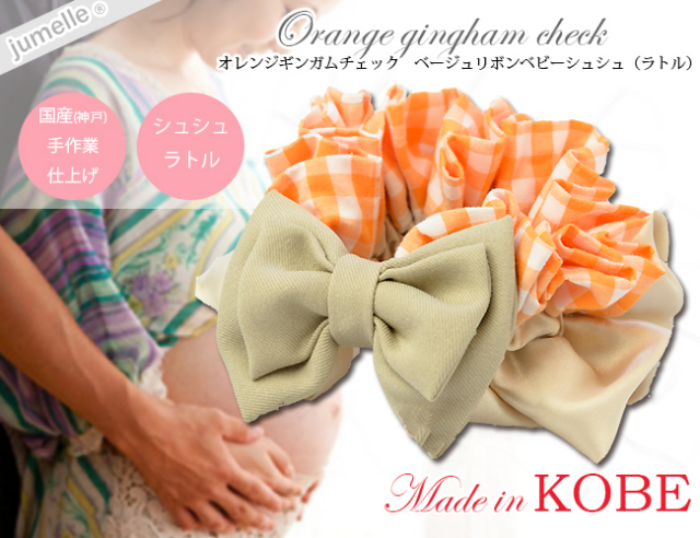 【親子お揃いプレゼント】オレンジギンガムチェックとベージュリボンシュシュ【出産祝い/誕生日/ジュメル神戸/妻】詳細