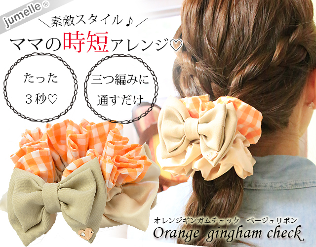 【親子お揃いプレゼント】オレンジギンガムチェックとベージュリボンシュシュ【出産祝い/誕生日/ジュメル神戸/妻】3サイズ