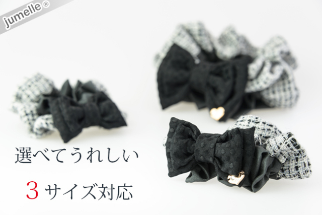 お選び頂いた(料金;別途)ジュメルの親子お揃いシュシュを、シュシュ袋(無料)に品良くお入れして、バスケットに可愛くお入れ致します。