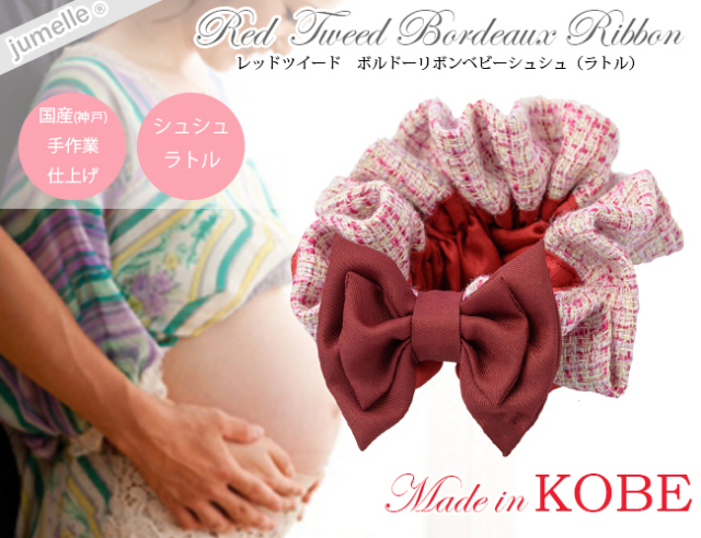 親子お揃いシュシュ(ペアヘアアクセサリー)専門店ジュメルツイードレッドボルドーリボンベビーラトル【出産祝い/誕生日/記念】メイン