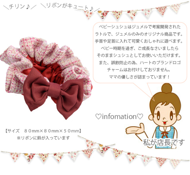 親子お揃いシュシュ(ペアヘアアクセサリー)専門店ジュメルツイードレッドボルドーリボンベビーラトル【出産祝い/誕生日/記念】サイズ小