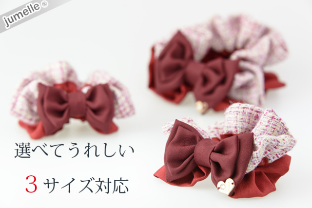 div style="width:100%;"> 親子お揃いシュシュ(ペアヘアアクセサリー)専門店ジュメルツイードレッドボルドーリボン【出産祝い/誕生日/記念】3サイズ