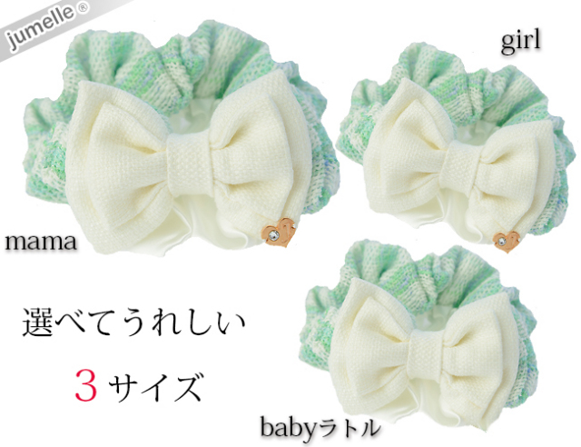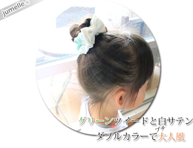 お選び頂いた(料金;別途)ジュメルの親子お揃いシュシュを、シュシュ袋(無料)に品良くお入れして、バスケットに可愛くお入れ致します。