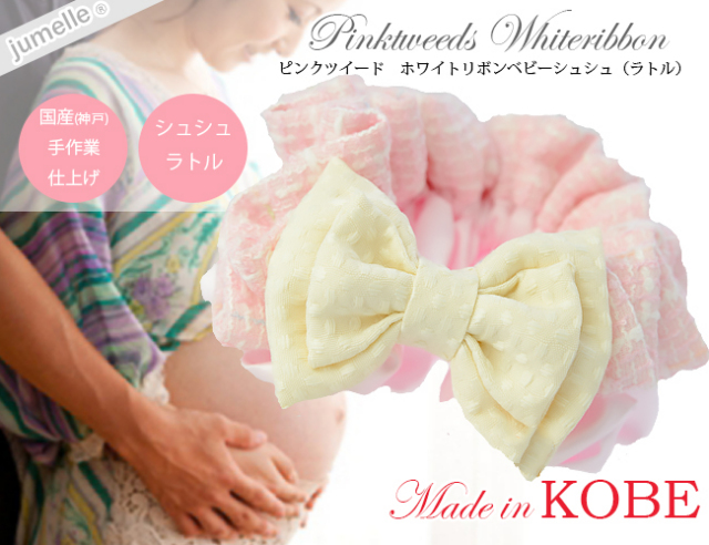 • 【親子お揃いプレゼント/高級シュシュ】ピンクツイードと白ドットリボンのベビーシュシュラトル【出産祝い/ペア/誕生日/ジュメル神戸】